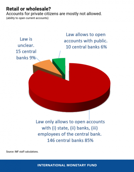 Another important design feature is whether the digital currency is to be used only at the “wholesale” level, by financial institutions, or could be accessible to the general public (“retail”). Commercial banks hold accounts with their central bank, being therefore their traditional “clients.” Allowing private citizens’ accounts, as in retail banking, would be a tectonic shift to how central banks are organized and would require significant legal changes. Only 10 central banks in our sample would currently be allowed to do so.